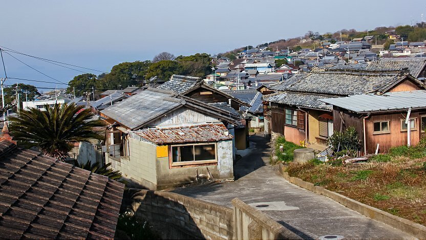Distrik Ura terletak sekitar 50 meter di atas gunung di lereng curam yang menghadap ke kawasan tepi laut. Rumah-rumah bertingkat ini dibangun selama Zaman Edo , dan bangunan-bangunan abadi serta teras-teras berdinding batunya dihubungkan oleh labirin jalur sempit dan tangga. Daerah ini telah muncul di beberapa film di masa lalu karena pesona pulau yang sudah usang, meskipun saat ini banyak rumah yang terbengkalai. Distrik Itamochi, sekitar 30 menit berjalan kaki ke pantai timur pulau, dulunya hanya memiliki satu penduduk tetapi sekarang sudah ditinggalkan.
